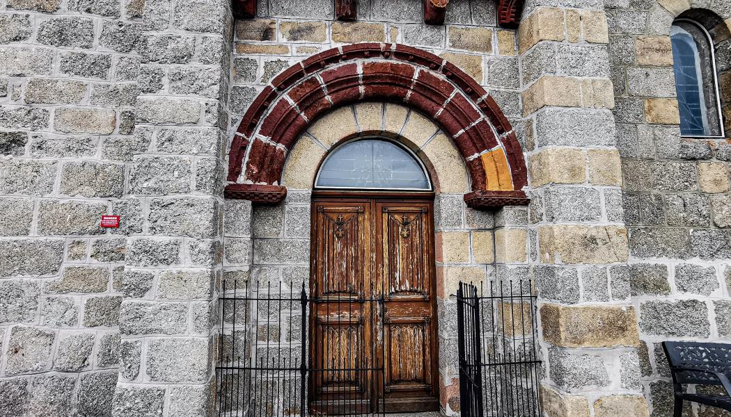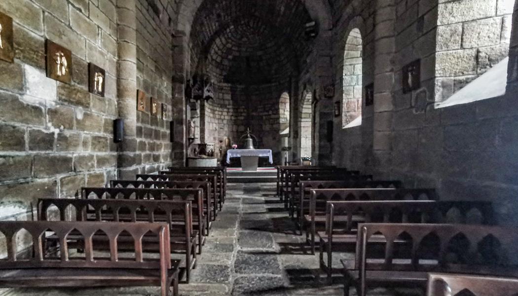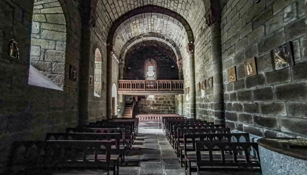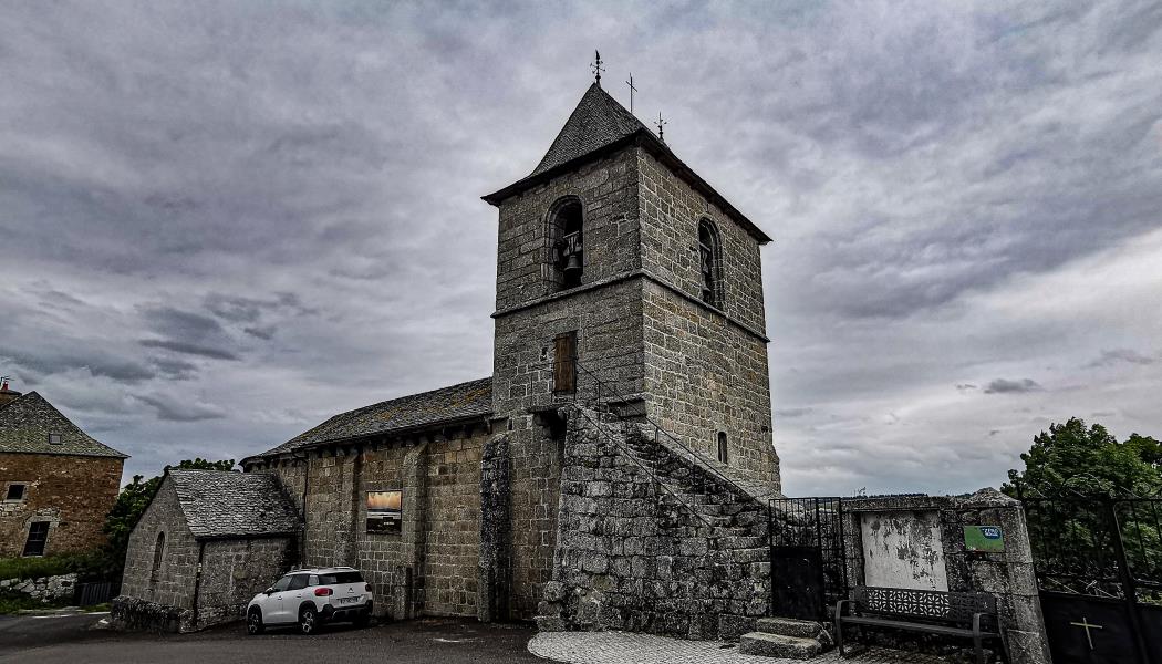 L’église, elle aussi, abrite une remarquable croix des Templiers. Elle se distingue également par une architecture particulière. L’église Saint-Saturnin présente quatre travées contre trois habituellement. De même, de par sa haute altitude, elle ne présente des fenêtres que sur trois façades excluant ainsi la façade nord. L’homogénéité de son style est dynamisée par la couleur de la pierre volcanique rouge utilisée pour sa décoration et par les magnifiques chapiteaux sculptés d’animaux et de végétaux. Son portail est orné de voussures en plein-cintre et est dominé d’un échiquier sculpté notable.